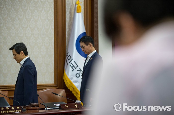 (서울=포커스뉴스) 14일 오전 서울 종로구 정부서울청사에서 열린 국무회의에 참석한 황교안 국무총리가 묵념을 하고 있다.