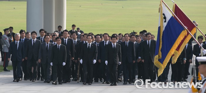 (서울=포커스뉴스) 정세균 국회의장과 정진석 새누리당 원내대표, 우상호 더불어민주당 원내대표, 박지원 국민의당 원내대표, 20대 국회 전반기 상임위원장들이 14일 오전 동작구 국립서울현충원을 방문해 참배를 위해 이동하고 있다.