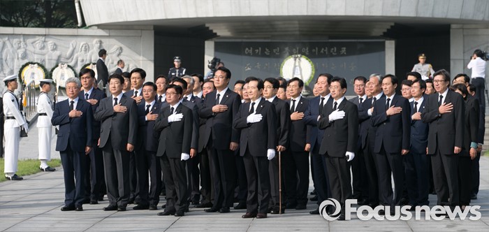 (서울=포커스뉴스) 정세균 국회의장과 정진석 새누리당 원내대표, 우상호 더불어민주당 원내대표, 박지원 국민의당 원내대표, 20대 국회 전반기 상임위원장들이 14일 오전 동작구 국립서울현충원을 방문해 참배를 마친 뒤 국기에 대한 경례를 하고 있다.