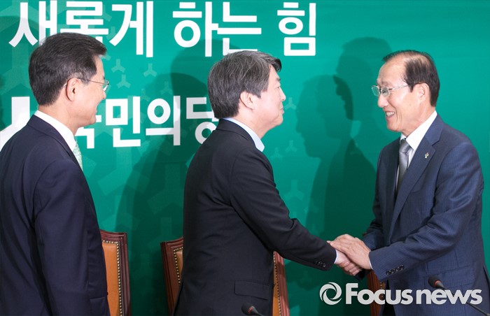 (서울=포커스뉴스) 안철수(가운데) 국민의당 상임공동대표, 천정배(왼쪽) 공동대표가 14일 오전 서울 여의도 국회를 방문한 이원종 대통령비서실장과 인사하고 있다.