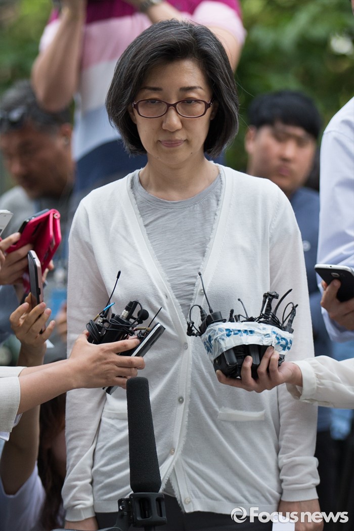 (서울=포커스뉴스) 미공개 정보를 이용해 주가하락 손실을 피한 혐의를 받고 있는 최은영 전 한진해운 회장이 14일 오전 서울 양천구 남부지방법원에서 영장실질심사를 받기 위해 법정으로 향하며 취재진 질문을 듣고 있다.