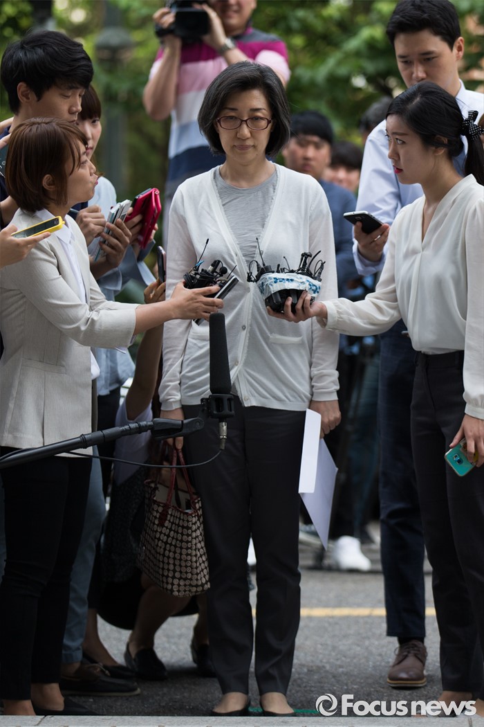(서울=포커스뉴스) 미공개 정보를 이용해 주가하락 손실을 피한 혐의를 받고 있는 최은영 전 한진해운 회장이 14일 오전 서울 양천구 남부지방법원에서 영장실질심사를 받기 위해 법정으로 향하며 취재진 질문을 받고 있다.