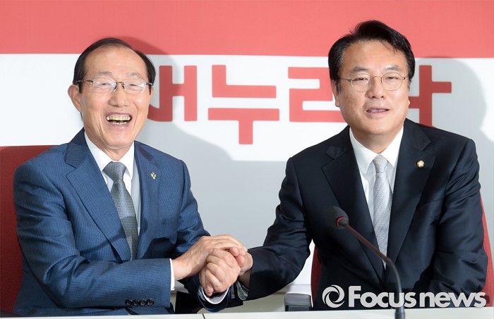 (서울=포커스뉴스) 정진석(오른쪽) 새누리당 원내대표가 14일 오전 서울 여의도 국회를 방문한 이원종 대통령비서실장과 면담에 앞서 악수하고 있다.