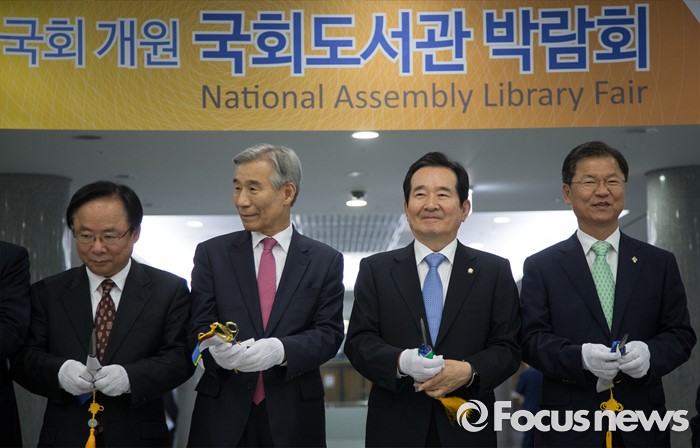 (서울=포커스뉴스) 정세균(왼쪽 세번째) 국회의장과 천정배(오른쪽) 국민의당 공동대표가 14일 오전 서울 여의도 국회 의원회관에서 열린 국회도서관 박람회 개막식에 참석해 이은철(왼쪽 두번째) 국회도서관 관장과 함께 컷팅식을 하고 있다. 왼쪽은 이주영 새누리당 의원.
