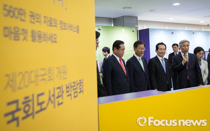 (서울=포커스뉴스) 정세균(오른쪽 세번째) 국회의장과 천정배(오른쪽 네번째) 국민의당 공동대표가 14일 오전 서울 여의도 국회 의원회관에서 열린 국회도서관 박람회 개막식에 참석해 이은철(오른쪽 두번째) 국회도서관 관장의 안내를 받으며 국회 도서관 박람회에 관한 설명을 듣고 있다.