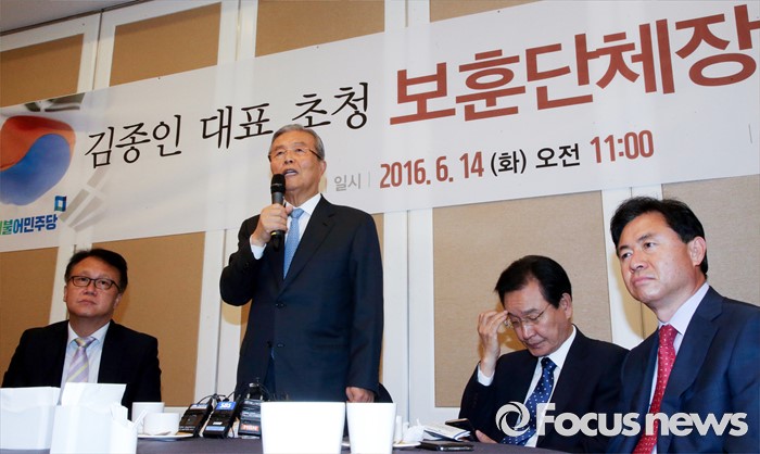 (서울=포커스뉴스) 김종인(왼쪽 두번째) 더불어민주당 비대위 대표가 14일 오전 서울 여의도 국회 귀빈식당에서 열린 보훈단체장과의 간담회에 참석해 인사말을 하고 있다.