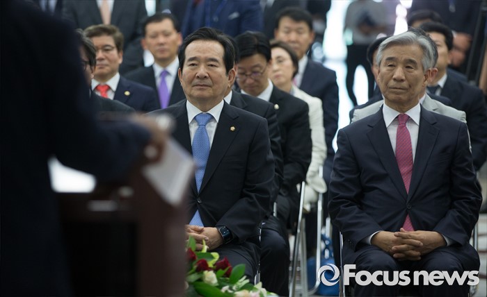 (서울=포커스뉴스) 정세균(오른쪽 두번째) 국회의장이 14일 오전 서울 여의도 국회 의원회관에서 열린 국회도서관 박람회 개막식에 참석해 이은철 국회도서관 관장과 나란히 앉아 있다.