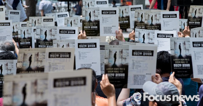 (서울=포커스뉴스) 14일 오전 서울시청 앞 인도에서 민주노총 공공운수노조와 서울지하철노조 관계자들이 스크린도어 희생자 추모 및 안전인력 확보를 위한 현장간부 결의대회를 하고 있다.
