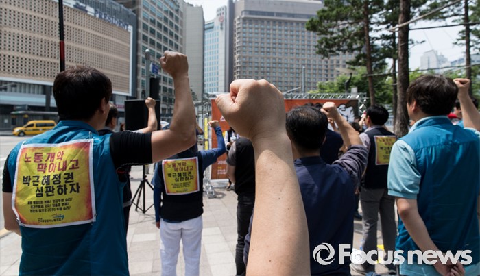 (서울=포커스뉴스) 14일 오전 서울시청 앞 인도에서 민주노총 공공운수노조와 서울지하철노조 관계자들이 스크린도어 희생자 추모 및 안전인력 확보를 위한 현장간부 결의대회를 하고 있다.