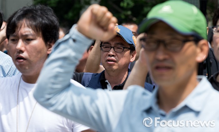 (서울=포커스뉴스) 14일 오전 서울시청 앞 인도에서 민주노총 공공운수노조와 서울지하철노조 관계자들이 스크린도어 희생자 추모 및 안전인력 확보를 위한 현장간부 결의대회를 하고 있다.