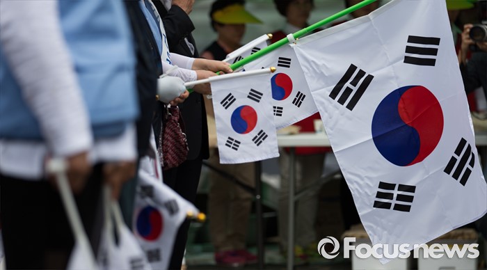 (서울=포커스뉴스) 14일 오후 서울역광장에서 열린 '북핵 규탄 및 평화통일 기원대회'에 참가한 한국자유총연맹 회원들이 태극기를 들고 있다.