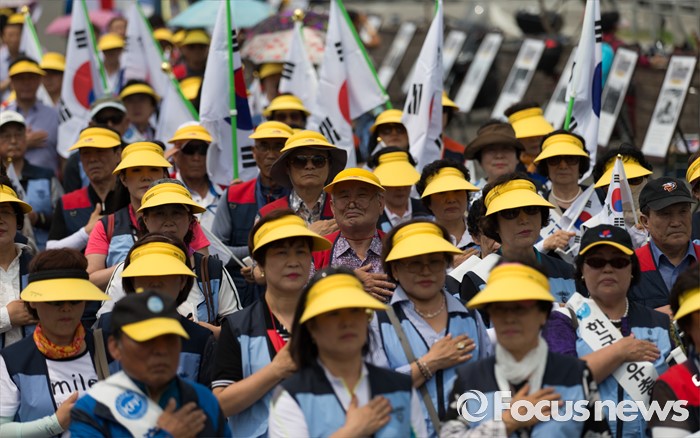 (서울=포커스뉴스) 14일 오후 서울역광장에서 열린 '북핵 규탄 및 평화통일 기원대회'에 참가한 한국자유총연맹 회원들이 국민의례 하고 있다.