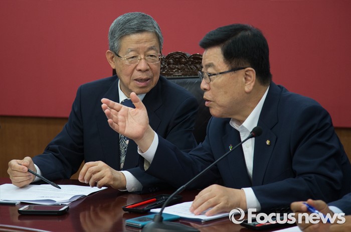 (서울=포커스뉴스) 김희옥(왼쪽)새누리당 혁신비상대책위원장과 김광림(오른쪽 세번째) 정책위의장이 14일 오후 서울 여의도 국회에서 열린 혁신비상대책위원 회의에서 대화하고 있다.