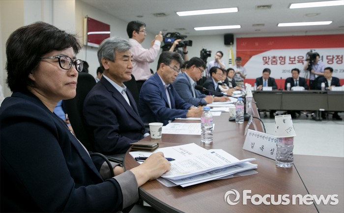 (서울=포커스뉴스) 14일 오후 서울 여의도 국회에서 열린 맞춤형 보육 관련 당정간담회에 참석한 김옥심(왼쪽) 한국가정어린이집연합회장 등 참석자들이 방문규 보건복지부 차관의 발언을 듣고 있다.