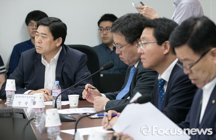 (서울=포커스뉴스) 14일 오후 서울 여의도 국회에서 열린 맞춤형 보육 관련 당정간담회에 참석한 정광진(왼쪽 첫번째) 한국어린이집총연합회장과 의원들이 방문규 보건복지부 차관의 발언을 듣고 있다.