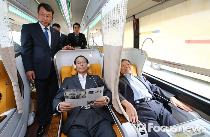 (세종=포커스뉴스) 프리미엄 고속버스 도입에 앞서 시승행사가 14일 오전 세종시 청부세종청사 제2주차장에서 열렸다. 최정호 국토교통부 2차관이 관계정로부터 현대자동차 21인승 프레스티지 유니버스에 대한 설명을 듣고 있다.