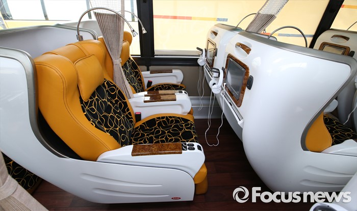 (세종=포커스뉴스) 프리미엄 고속버스 도입에 앞서 시승행사가 14일 오전 세종시 정부세종청사 제2주차장에서 열렸다. 사진은 현대자동차 21인승 프레스티지 유니버스 내부모습.
