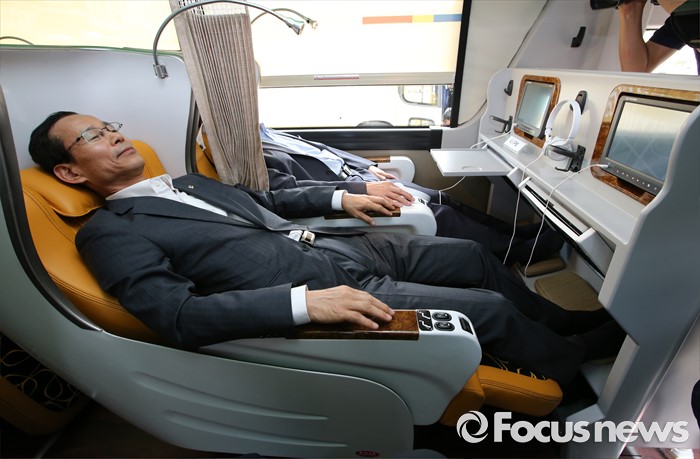 (세종=포커스뉴스) 프리미엄 고속버스 도입에 앞서 시승행사가 14일 오전 세종시 정부세종청사 제2주차장에서 열렸다. 최정호 국토교통부 2차관이 관계자로부터 현대자동차 21인승 프레스티지 유니버스에 대한 설명을 듣고 있다.