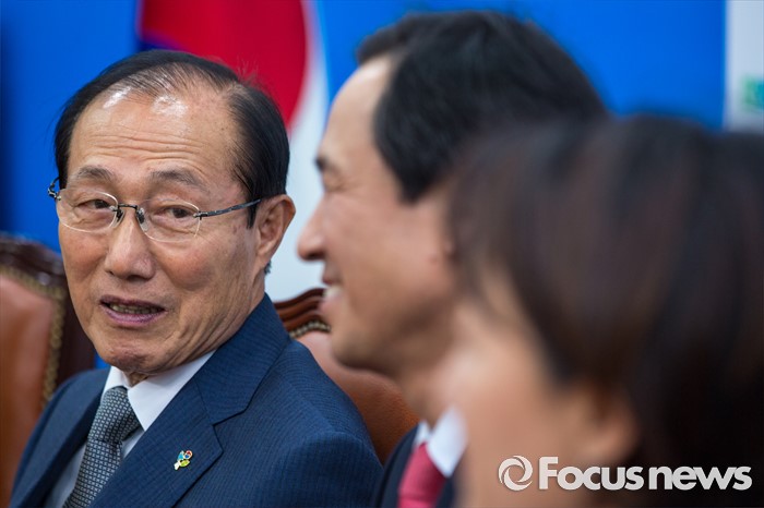 (서울=포커스뉴스) 이원종(왼쪽) 대통령비서실장이 14일 오후 서울 여의도 국회에서 우상호 더불어민주당 원내대표를 예방 하고 있다.