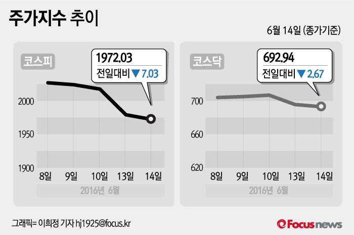 (서울=포커스뉴스) 14일 코스피지수는 전날 보다 0.36%(7.03포인트) 내린 1972.03에 장을 마쳤다. 코스닥지수는 전일 대비 0.38%(2.67포인트) 내린 692.94에 마감했다.