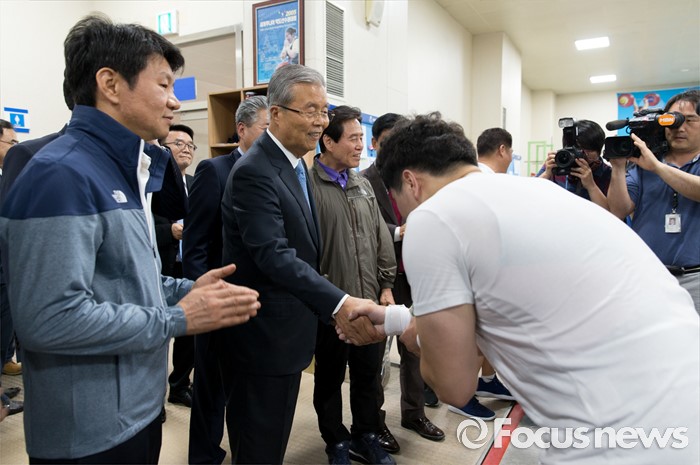 (서울=포커스뉴스) 리우데자네이루 하계올림픽을 52일여 앞둔 14일 오후 서울 노원구 태릉선수촌을 방문한 김종인 더불어민주당 비상대책위원회 대표가 역도 국가대표 선수들을 격려하고 있다.