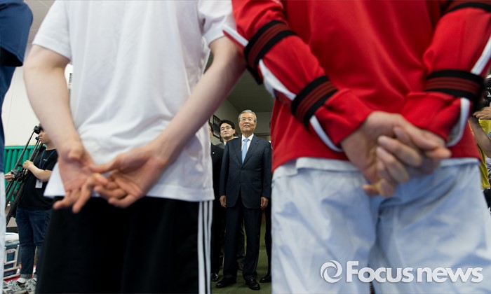 (서울=포커스뉴스) 리우데자네이루 하계올림픽을 52일여 앞둔 14일 오후 서울 노원구 태릉선수촌을 방문한 김종인 더불어민주당 비상대책위원회 대표가 태권도 국가대표 선수들을 격려하고 있다.