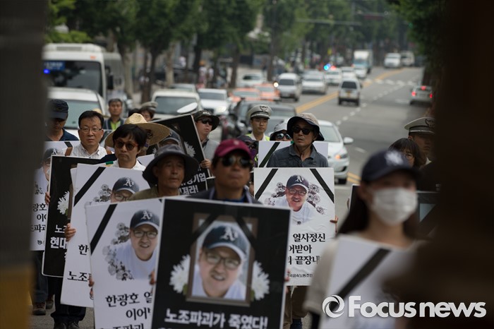 (서울=포커스뉴스) 14일 오후 유성기업 노동자 故 한광호씨의 분향소를 양재동 현대차 본사 앞으로 옮기는 꽃길 100리 행진 2일째에 참여한 노동자들이 국회를 출발해 한남동 현대차 정몽구 회장 집으로 행진하고 있다.