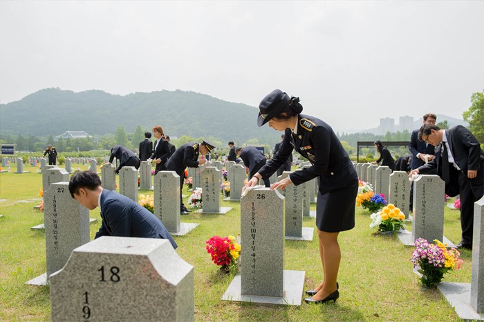 (대전=포커스뉴스) 국민안전처 직원들이 호국보훈의 달을 맞아 14일 대전현충원을 찾아 순국선열 및 호국영령에 대해 참배하고, 소방 및 해경 묘역을 찾아 묘역 주변을 정비하고 있다. <사진제공=국민안전처>