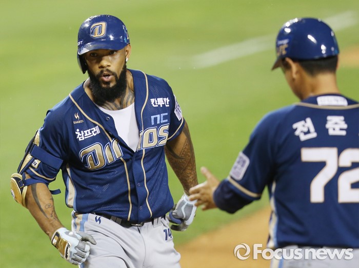 (서울=포커스뉴스) 14일 서울 잠실구장에서 열린 2016 프로야구 NC-LG 경기 6회초 1사후 NC 테임즈가 우월 솔로 홈런을 치고 전준호 코치의 환영을 받으며 홈인하고 있다.