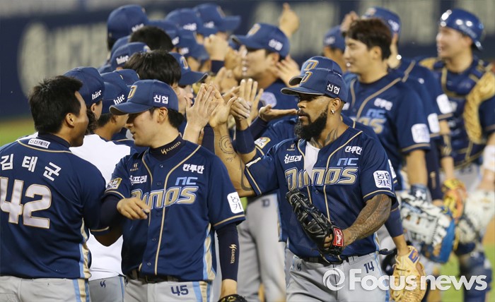 (서울=포커스뉴스) 14일 서울 잠실구장에서 열린 2016 프로야구 NC-LG 경기에서 9회에 대량 득점하며 LG에 역전승하며 11연승한 NC 선수들이 하이파이브하고 있다.