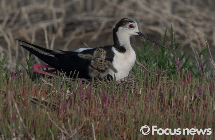 (인천=포커스뉴스) 하루 사이로 먼저 부화한 장다리물떼새 새끼가 나머지 알을 품고 있는 아빠를 보채고 있다.