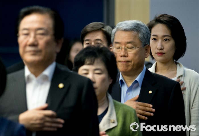 (서울=포커스뉴스) 15일 오전 서울 여의도 국회 의원회관에서 열린 15차 국민의당 정책역량강화 집중 워크숍에 참석한 김수민(오른쪽 첫번째), 박준영(왼쪽 첫번째) 의원 등이 국기에 대한 경례를 하고 있다.