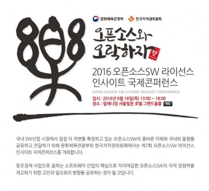 (서울=포커스뉴스) 문화체육관광부가 주최하고 한국저작권위원회가 주관하는 '제7회 오픈소스소프트웨어 라이선스 국제 콘퍼런스'가 오는 16일 오후 1시부터 밀레니엄 서울 힐튼 호텔에서 개최된다.