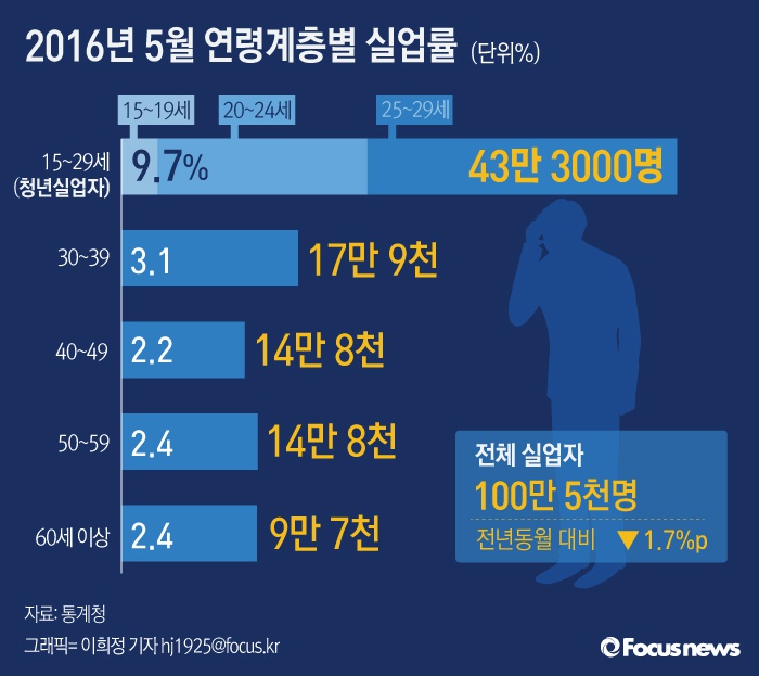 (서울=포커스뉴스) 통계청이 16일 발표한 '5월 고용동향'에 따르면 5월 청년(15∼29세)실업률은 9.7%로 전년동월대비 0.4%포인트 증가했다.