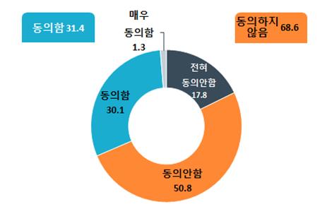 이번 조사결과에 따르면, 최근 정부가 입법예고한 대기업집단 지정기준을 자산총액 10조원으로 상향하는 것에 대해 응답자의 68.6%('전혀 동의안함' 17.8%, '동의안함' 50.8%)가 "동의하지 않는다"는 입장을 표했다.