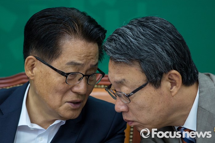 (서울=포커스뉴스) 박지원(왼쪽) 국민의당 원내대표와 김성식 정책위의장이 15일 오전 서울 여의도 국회에서 열린 최고위원회의에 참석해 대화를 나누고 있다.
