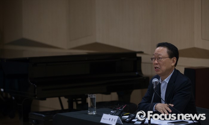 (서울=포커스뉴스) 15일 오전 서울 종로구 세종문화회관 서울시립교향악단 연습실에서 최흥식 서울시향 대표가 기자간담회에 참석해 취재진의 질문에 답하고 있다.