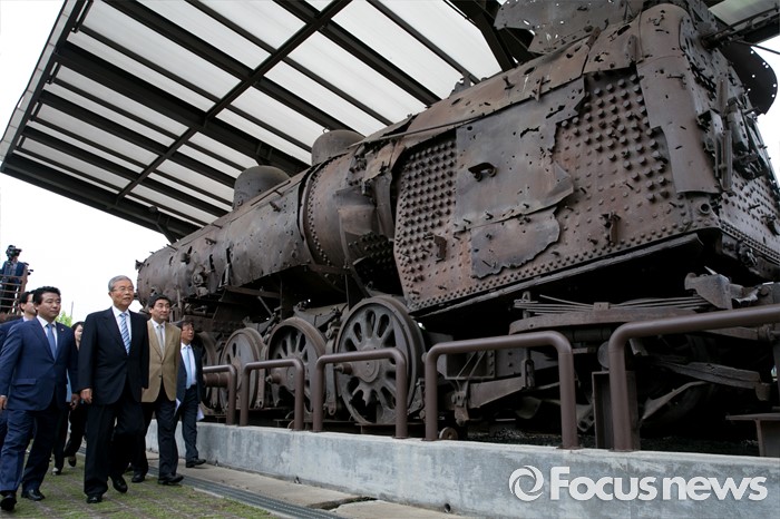 (파주=포커스뉴스) 15일 오전 경기도 파주 임진각 통일전망대에서 더불어민주당 비상대책위원회의를 마친 김종인 비대위 대표와 의원들이 전시된 경의선 장단역 증기기관차를 둘러보고 있다.