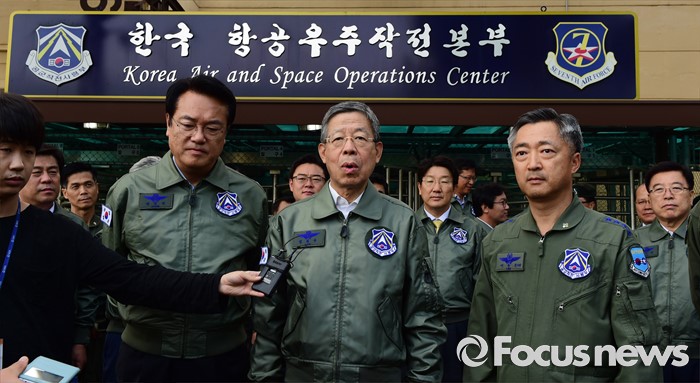 (오산=포커스뉴스) 김희옥(가운데) 새누리당 혁신비대위원장과 정진석(왼쪽) 원내대표 등 의원들이 15일 오전 경기도 오산 공군작전사령부를 방문해 방위태세 현황 등 보고를 받기에 앞서 취재진 질문에 답하고 있다. 오른쪽은 이왕근 공군 작전사령관.