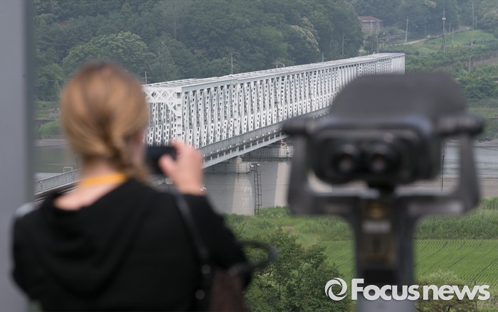 (파주=포커스뉴스) 6·15 남북공동선언 16주기인 15일 오전 경기도 파주 임진각 통일전망대를 방문한 관광객들이 북녘을 살펴보고 있다.