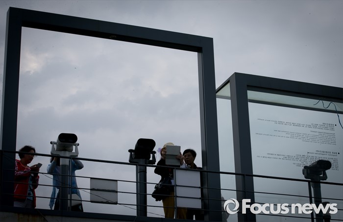 (파주=포커스뉴스) 6·15 남북공동선언 16주기인 15일 오전 경기도 파주 임진각 통일전망대를 방문한 관광객들이 북녘을 살펴보고 있다.