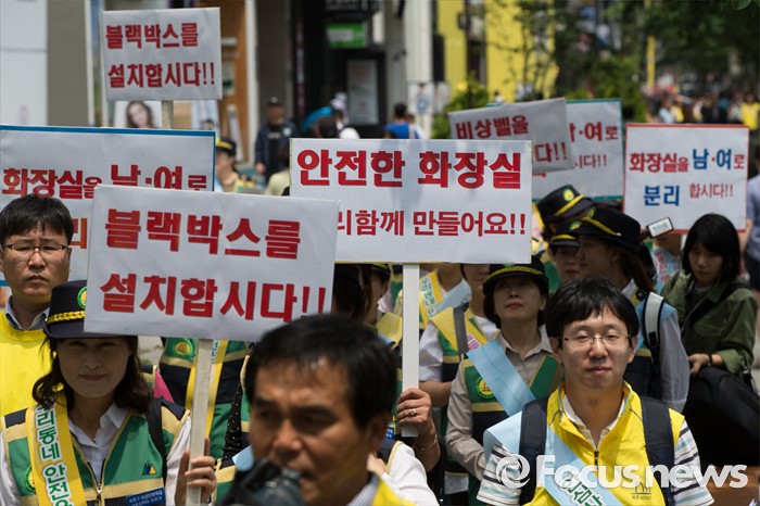 (서울=포커스뉴스) 15일 오전 서울 강남구 강남역인근에서 안전문화운동 실천협의회, 여성 민방대원들이 여성 안전 대책을 촉구하며 캠페인을 벌이고 있다.