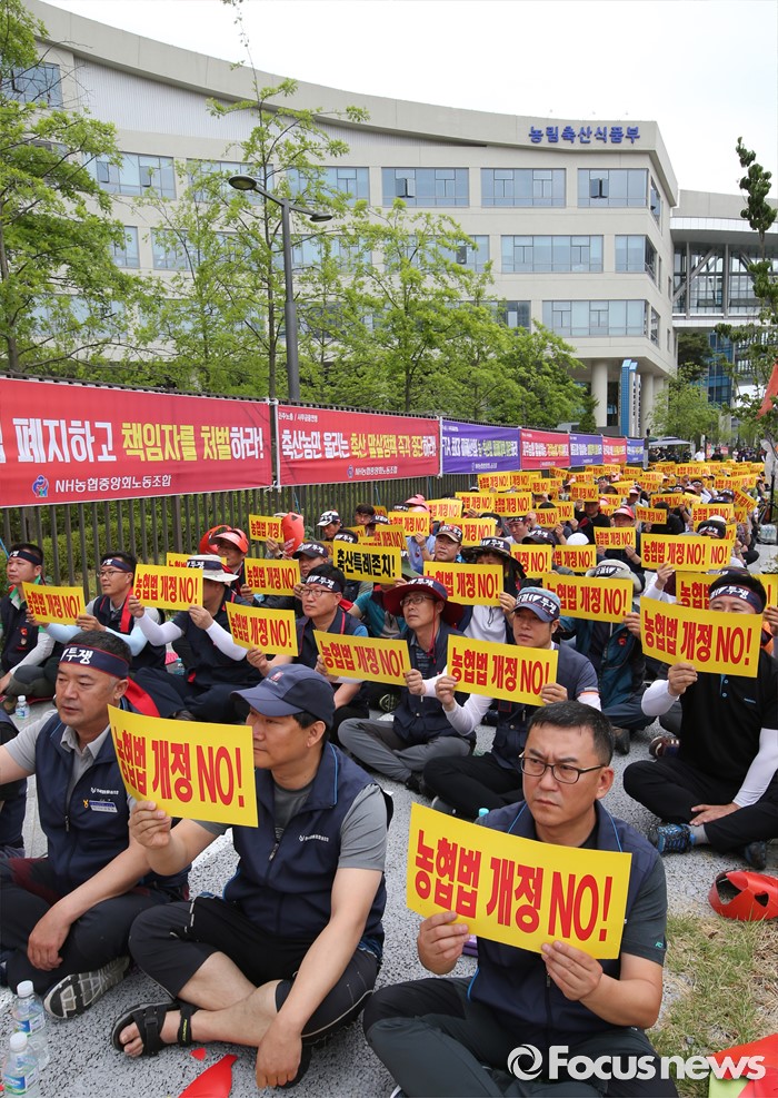 (세종=포커스뉴스) NH농협중앙회노동조합 구성원들이 15일 오전 세종시 정부세종청사 농림축산식품부 앞에서 농협법 개정안 반대 투쟁 선포식을 열고 농협법 개정반대를 촉구하고 있다.