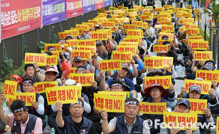(세종=포커스뉴스) NH농협중앙회노동조합 구성원들이 15일 오전 세종시 정부세종청사 농림축산식품부 앞에서 농협법 개정안 반대 투쟁 선포식을 열고 농협법 개정반대를 촉구하고 있다.
