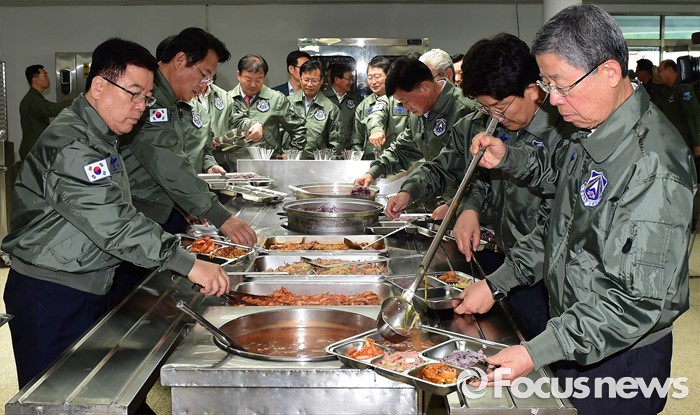 (오산=포커스뉴스) 김희옥 새누리당 혁신비상대책위원장, 정진석 원내대표 등 의원들이 15일 오후 경기도 오산 공군작전사령부를 방문해 오찬을 위해 배식하고 있다.