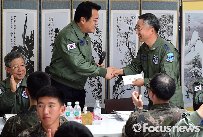 (오산=포커스뉴스) 정진석(왼쪽) 새누리당 원내대표가 15일 오후 경기도 오산 공군작전사령부를 방문해 장병들과의 오찬을 가진 뒤 이왕근 공군 작전사령관에게 격려금을 전달하고 있다.