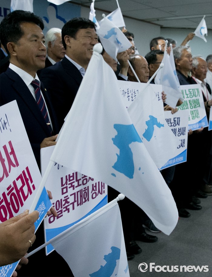 (서울=포커스뉴스) 15일 오후 서울 여의도 국회도서관에서 남북노동자통일축구대회 공동추진위원회 결성식를 마친 김동만 한국노총 위원장, 최종진 민주노총 위원장 직무대행 등 남측 추진위원회 참석자들이 한반도기를 흔들며 취재진을 향해 포즈를 취하고 있다.