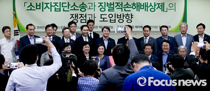 (서울=포커스뉴스) 15일 오후 서울 여의도 국회 의원회관에서 열린 '소비자 집단소송과 징벌적 손해배상제도 쟁점과 방향' 토론회에 참석한 안철수 국민의당 상임공동대표, 천정배 공동대표, 박지원 원내대표 등 의원 및 참석자들이 기념촬영을 하고 있다.