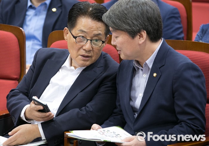 (서울=포커스뉴스) 15일 오후 서울 여의도 국회 의원회관에서 열린 '소비자 집단소송과 징벌적 손해배상제도 쟁점과 방향' 토론회에 참석한 안철수(오른쪽) 국민의당 상임공동대표와 박지원 원내대표가 대화하고 있다.
