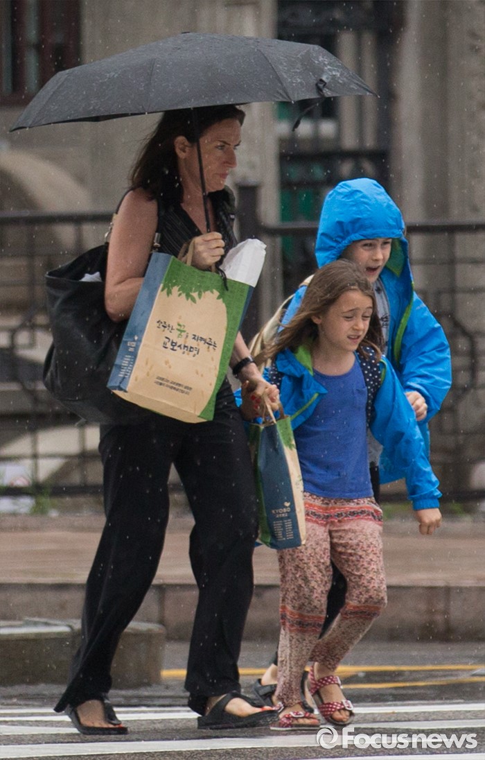 (서울=포커스뉴스) 전국적으로 비가 내리는 15일 오후 서울 종로구 광화문광장을 지나는 외국인 가족이 비를 피해 발걸음을 재촉하고 있다.